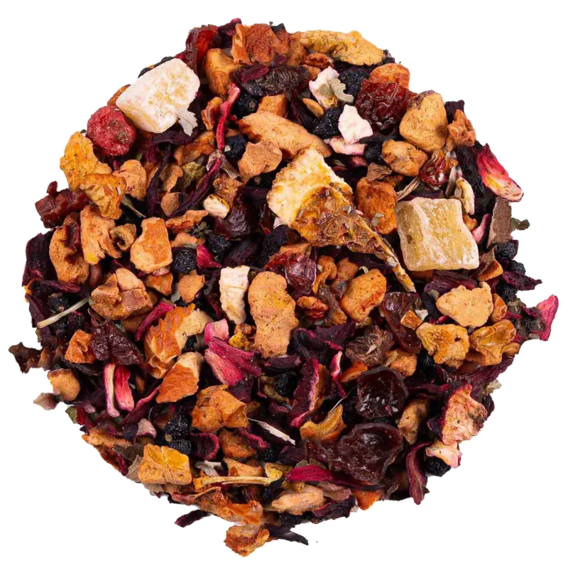 Die Hauptbestandteile dieses köstlichen Tees sind sorgfältig ausgewählte Apfelstücke, die dem Tee eine angenehme Frische und natürliche Süße verleihen. Die leuchtend roten Hibiscusblüten sorgen für eine ansprechende Farbe und bringen eine leicht säuerliche Note ein, die den Geschmack harmonisch abrundet. Die sonnenverwöhnten Ananasstücke, verleihen dem Tee einen exotischen Charakter und einen Hauch von Süße. Die Zugabe von Hagebutte und Holunderbeere bringt eine fruchtige Fülle und eine leicht herbe Note in die Mischung. Die frischen Orangenschalen und Orangenspalten bringen eine zitrusartige Frische und eine erfrischende Komponente in den Tee. Die sanften Brombeerblätter verleihen dem Geschmack eine weitere Nuance und runden das Aroma harmonisch ab. Die Kombination aus saftiger Kirsche, roten Johannisbeeren und schwarzen Johannisbeeren sorgt für eine angenehme Süße und eine vollmundige Fruchtigkeit, die den Tee zu einem wahren Genuss machen.