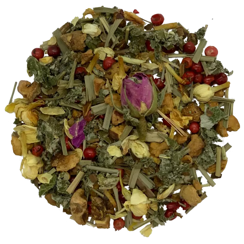 Die Kombination aus Zitronengras, rotem Pfeffer und Koriander verleiht diesem Tee eine erfrischende und zugleich sanft würzige Note. Jeder Schluck offenbart eine harmonische Balance zwischen Frische und mildem Pep. Doch das ist noch nicht alles. Die Faulenzer Mischung überrascht Sie auch mit einer leichten Süße, die von den köstlichen Apfelstücken und Himbeerblättern stammt. Hier entfaltet sich eine angenehme, natürliche Süße, die den Geschmack abrundet und für eine genussvolle Komplexität sorgt. Das Besondere an diesem Tee ist die Zugabe von Jasminblüten. Diese verleihen der Faulenzer Mischung einen verführerischen Kick und sorgen für ein einzigartiges Geschmackserlebnis. Die Jasminblüten verbinden sich auf harmonische Weise mit den anderen Zutaten und setzen einen aromatischen Akzent, der den Tee zu etwas ganz Besonderem macht.Die sorgfältig ausgewählten Zutaten, wie Apfelstücke, rosa Pfeffer, Zitronengras, Himbeerblätter, Zimtstücke, Koriander und pinke Rosenknospen, werden zu einer harmonischen Komposition vereint. Jede Tasse der Faulenzer Mischung ist ein Moment der Entspannung und des Genusses, der Ihnen eine wohlverdiente Auszeit schenkt.