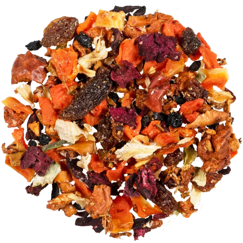 Die Basis dieser köstlichen Mischung bilden sorgfältig ausgewählte Karottenstücke und saftige Apfelstücke, die durch ihre leichte Säure perfekt ergänzt werden. Die Weinbeeren verleihen diesem Tee eine sanfte Süße, während die Rote Beetestücke und Holunderbeeren eine tiefere, dunkle Note hinzufügen. Hibiscusblüten und Holunderblüten verleihen dem Tee eine blumige Nuance und eine angenehme Frische. Doch das Geheimnis dieser Mischung liegt in unserer einzigartigen Multivitaminmischung, die sorgfältig auf die natürliche Fruchtnote des Holunders abgestimmt ist. Diese Mischung enthält eine Vielzahl an Vitaminen und Nährstoffen, die Ihren Körper beleben. Mit einer Extraportion Vitamin C und einer sorgfältigen Auswahl weiterer Vitalstoffe wird dieser Tee zu einem wahren Fruchterlebnis, das Ihre Geschmacksknospen verwöhnt und Ihren Körper mit Energie versorgt.